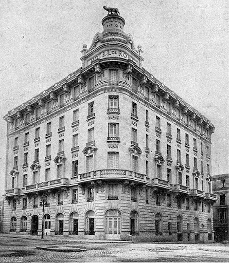 El antiguo Hotel Roma es el primer edificio terminado en la Gran Vía. Diseñado por el arquitecto Eduardo Reynals Toledo, quien firmó los planos en 1913, fue inaugurado por el rey Alfonso XIII en 1915. Presenta fachadas elegantes, con un basamento almohadillado, balcones corridos en el piso principal, ventanas con frontones curvos, un ático de remate y una potente cornisa volada. La imagen más representativa del edificio era una cartela con el nombre del hotel y una estatua en bronce de La Loba Capitolina.