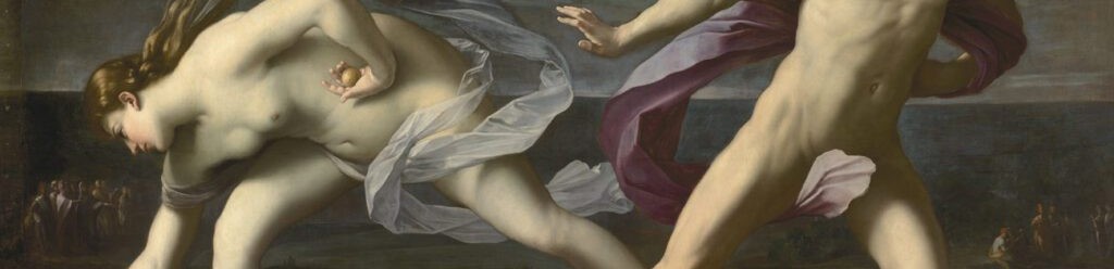 La historia que representa esta obra se remonta a las páginas de Las Metamorfosis de Ovidio Nasón. Reni captura el momento culminante de la carrera entre Hipómenes y Atalanta, una escena llena de tensión y drama. Atalanta, la hija del rey de Arcadia, se ve desafiada por Hipómenes, quien recibe la ayuda de Venus en forma de tres manzanas de oro para retrasar a su competidora. Este momento crucial, en el que Atalanta se inclina para recoger las manzanas, se convierte en el foco central de la composición de Reni.