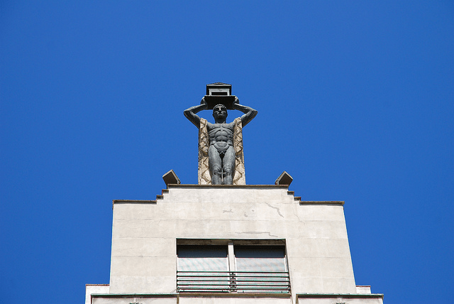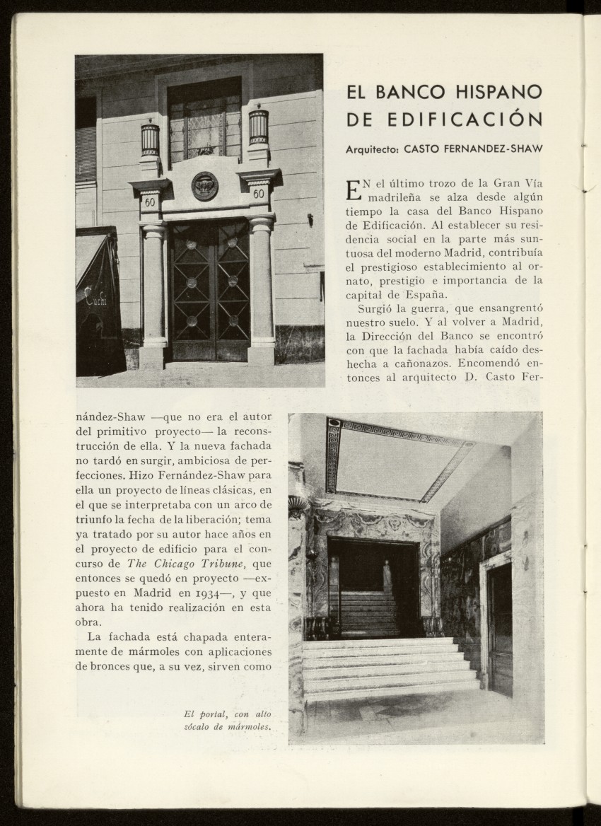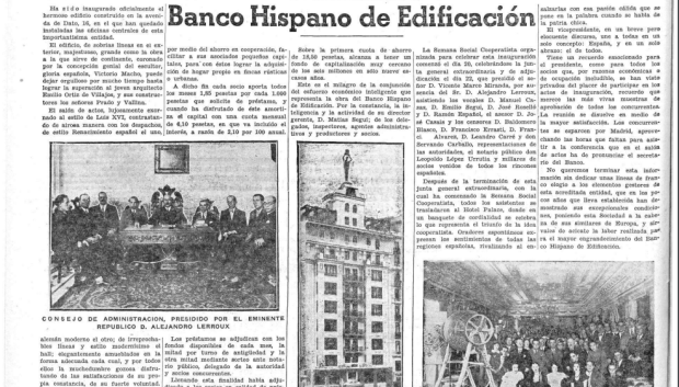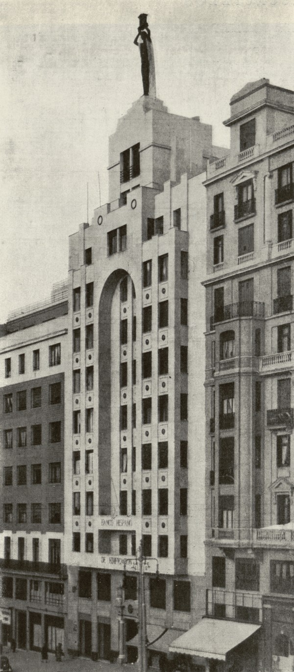 Construido en 1930 como un conjunto de oficinas y viviendas, este edificio diseñado por Emilio Ortiz de Villajos Müller albergaba la sede del Banco Hispano de la Edificación. Su imponente fachada, coronada por la escultura colosal «el Romano» del escultor Victorio Macho, lo distinguía como un símbolo arquitectónico en la Gran Vía.