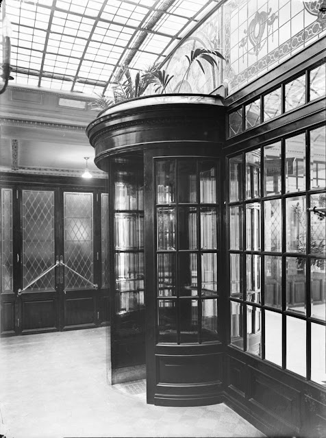 Una puerta giratoria de madera y cristal en el fondo del pasaje daba acceso al café, iluminada por cristaleras en la entrada y el techo. En el interior, escalones conducían a una gran sala con divanes tapizados, mesas de mármol, sillas de madera, altos techos y robustas columnas, decorada con molduras y frisos de madera en las paredes.