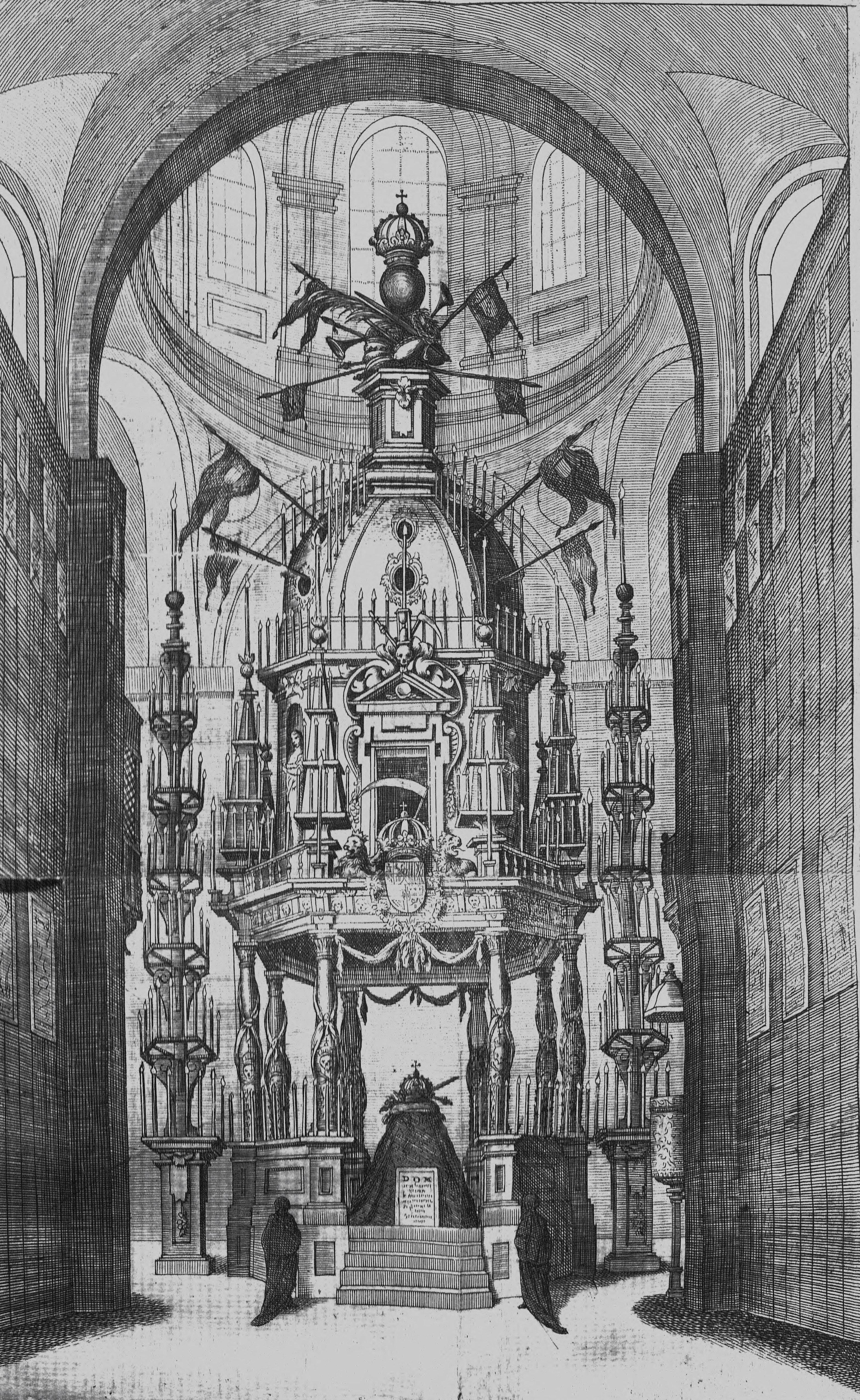 En 1665, el arquitecto Sebastián Herrera Barnuevo diseñó el túmulo del rey, que fue colocado en la iglesia del Monasterio de la Encarnación de Madrid, donde se celebraron las exequias, debido a su proximidad al Alcázar, lo cual era conveniente para el joven príncipe heredero, Carlos II. Sabemos cómo era este túmulo gracias a una estampa de Pedro de Villafranca y un dibujo, posiblemente del propio Herrera Barnuevo. La elección de la Encarnación limitó la magnitud del túmulo, pero toda la obra estuvo supervisada por el Marqués de Malpica, Superintendente de Obras Reales y Mayordomo Mayor.