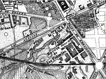 Las Peñuelas fue un barrio de viviendas de patio, donde se hacinaban obreros de la Fábrica de Papel de Santa Ana y de la Estación de Ferrocarril de Peñuelas.