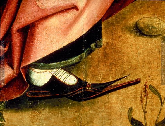 Hoy queremos hablaros del calzado medieval a través de una obra de la colección del Museo Thyssen-Bornemisza: Vestir al desnudo, del Maestro de la vista de Santa Gúdula, pintor activo en Bruselas entre 1460 y 1490.