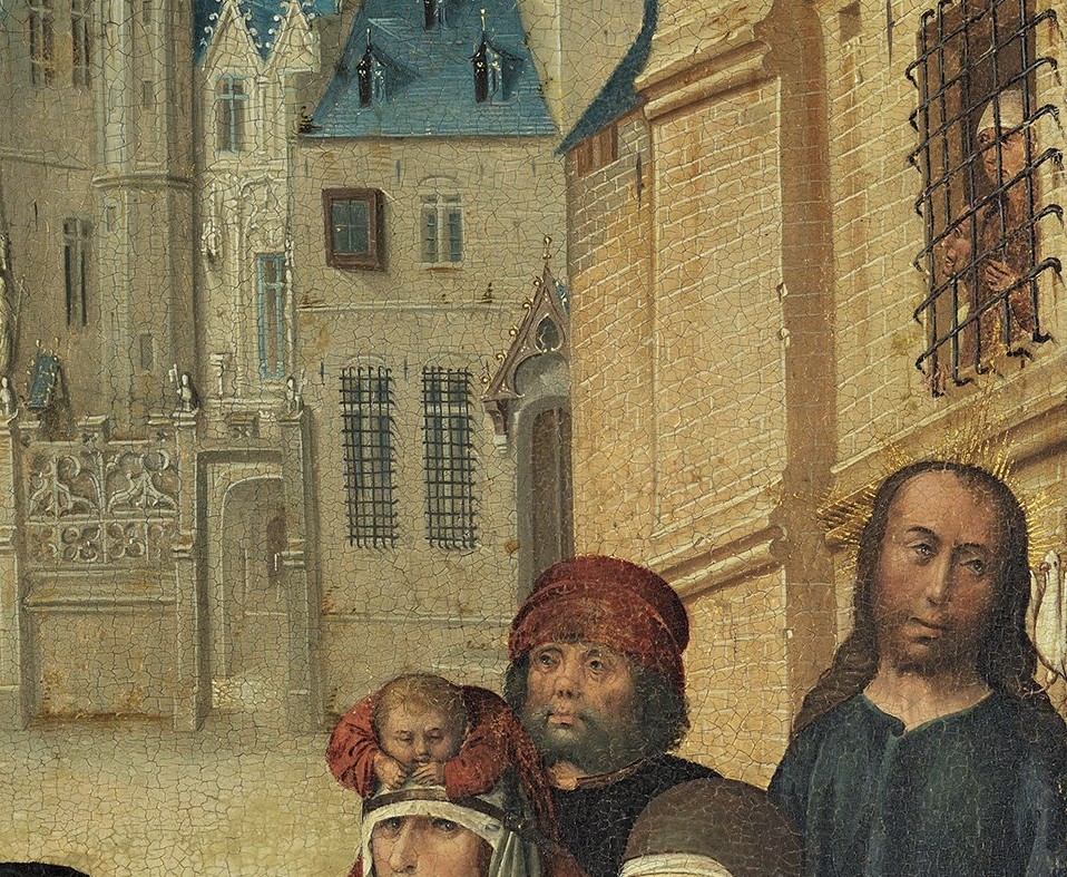 El asunto representado en esta tabla es una obra de misericordia: “dar de vestir al desnudo”. En el centro de la escena, una familia burguesa, probablemente de origen borgoñón por su atuendo, reparte limosna a tullidos, ciegos, huérfanos, en plena calle y ante la catedral de Bruselas. Entre ellos, también está presente la figura de Cristo, lo que refuerza el mensaje piadoso de la caridad cristiana ante la miseria generalizada de las ciudades de la época. La pobreza era estructural: las malas cosechas, las guerras, las epidemias y la falta de oportunidades conducían a muchos a la mendicidad.
