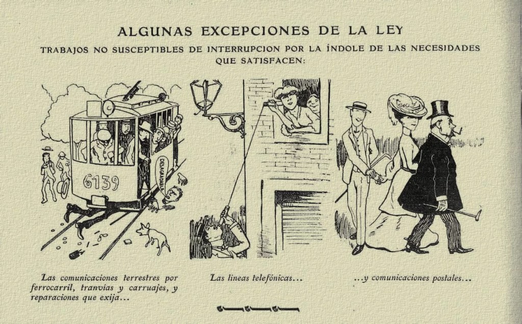 La promulgación oficial de la ley se publicó en la Gaceta de Madrid, donde se hacía constar que las Cortes habían decretado que quedaba «prohibido en domingo el trabajo por cuenta ajena, y el que se efectúe con publicidad por cuenta propia». La norma no afectaba a todos los sectores por igual: quedaban excluidos determinados establecimientos considerados de interés público o tradicional, como tabernas o espectáculos taurinos. Las infracciones podían sancionarse con multas de hasta 250 pesetas, cuya recaudación se destinaba a fines benéficos y de socorro para la clase obrera.